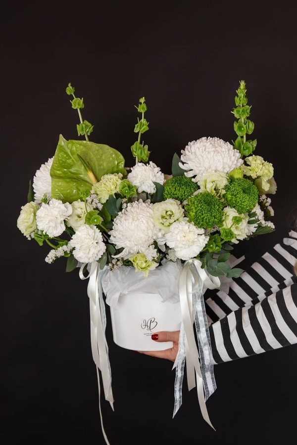 Эта композиция из роз, диантусов, эвкалипта и зелени создает аромат, напоминающий чай мате. Зеленая коробка подчеркивает свежесть и природность букета, который идеально подойдет для тех, кто ценит натуральность и гармонию с природой.